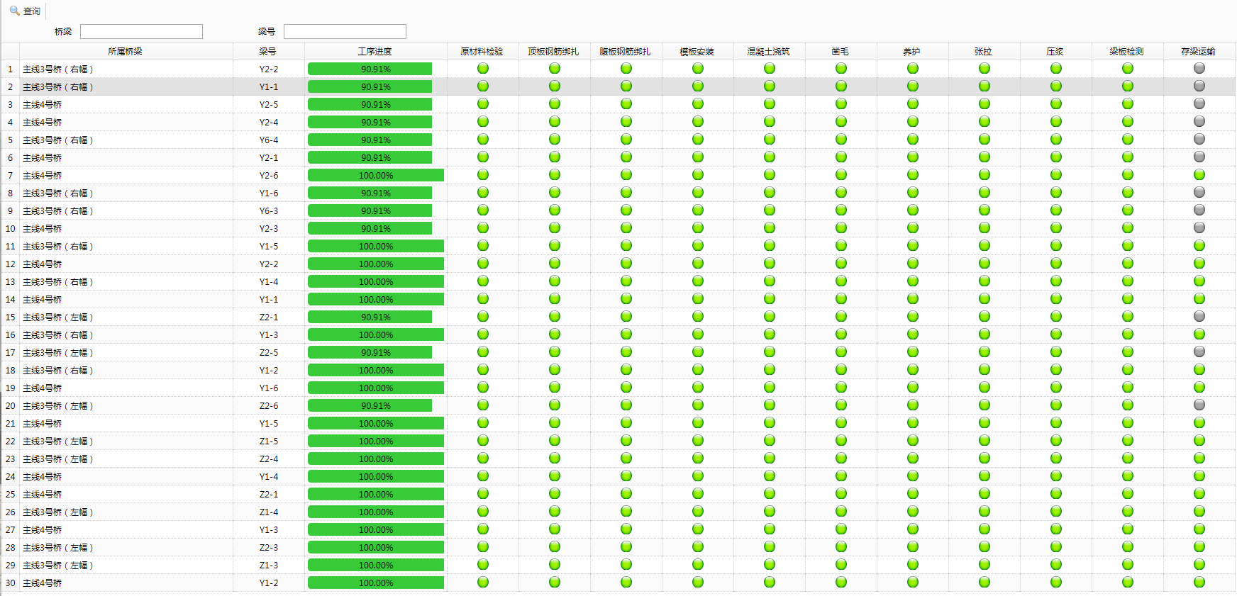 预制梁工序进度指示(绿灯表示改道工序已完成)