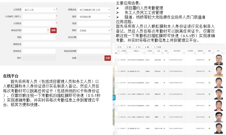 我们创新地将最为先进可靠的人眼虹膜识别技术引入项目人员考勤管理,以代替传统的指纹识别和人脸识别,杜绝指纹识别的考勤信息造假(指纹套)和人脸识别的因工人戴安全帽和脸脏导致的识别准确率下降。