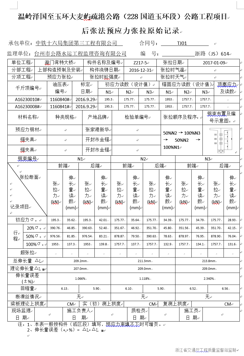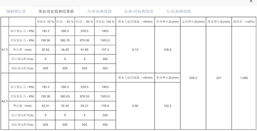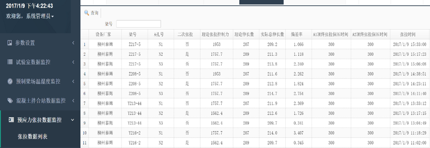 智能张拉监控系统特点:系统实时将每次张拉、压浆作业的数据通过设备无线模块上传至远程数据监管平台,同时上传过程数据、过程曲线图以及设定值和结果数据,完全杜绝人为造假可能。数据监管平台对智能拉系统的预制梁场、梁板基本信息、设备编码、梁板编号、梁板名称、浇注日期、孔道号、张拉时间、理论伸长量、实际总伸长量、伸长量误差、理论张拉应力、实际张拉应力、张拉应力误差、异常情况等关键张拉数据可进行实时查看或按梁号查询历史记录。