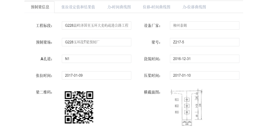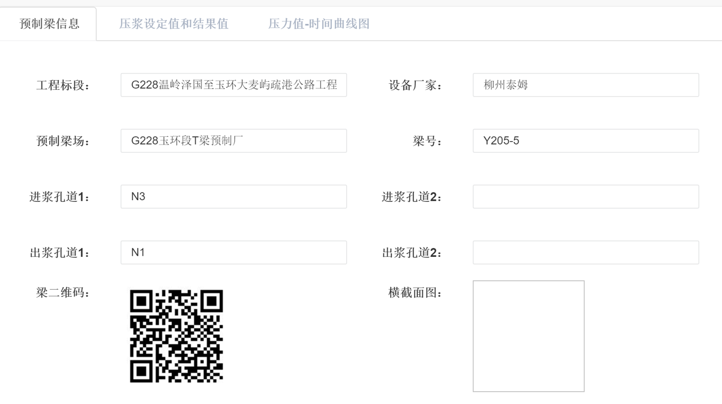 点击某条压浆记录数据行后,弹出含有多个页面的详细信息窗口;分类显示预制梁基本信息、压浆设定值与结果值、压力值-时间关系曲线图。