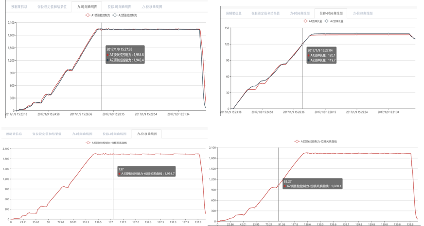 张拉过程曲线图(力-时间曲线图、位移-时间曲线图、力-位移曲线图,平直段代表终张拉持荷时间)