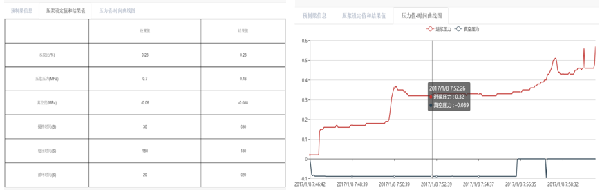 压浆设定值和结果值比较列表:从真空度(负压力)-时间曲线图的下台阶可直观判断本次压浆作业是否在真正地抽真空(浙江省压浆技术指南明确规定抽真空的负压力要达到-0.096MPa以上)。