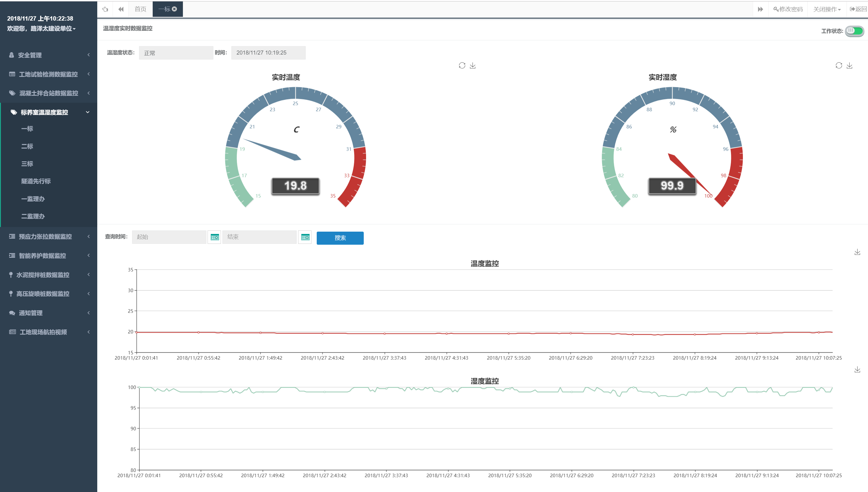 标养室中独立安装温湿度传感器,采集数据并实时监控;按规范要求,温度范围:20±2℃,湿度:〉95%,如不符合则给出报警。