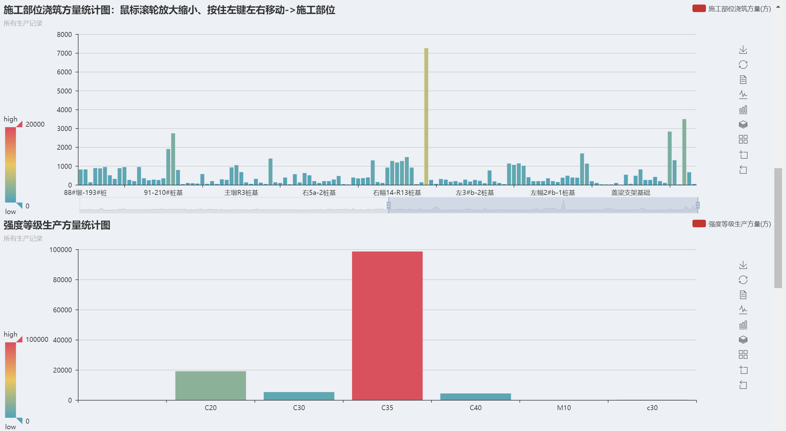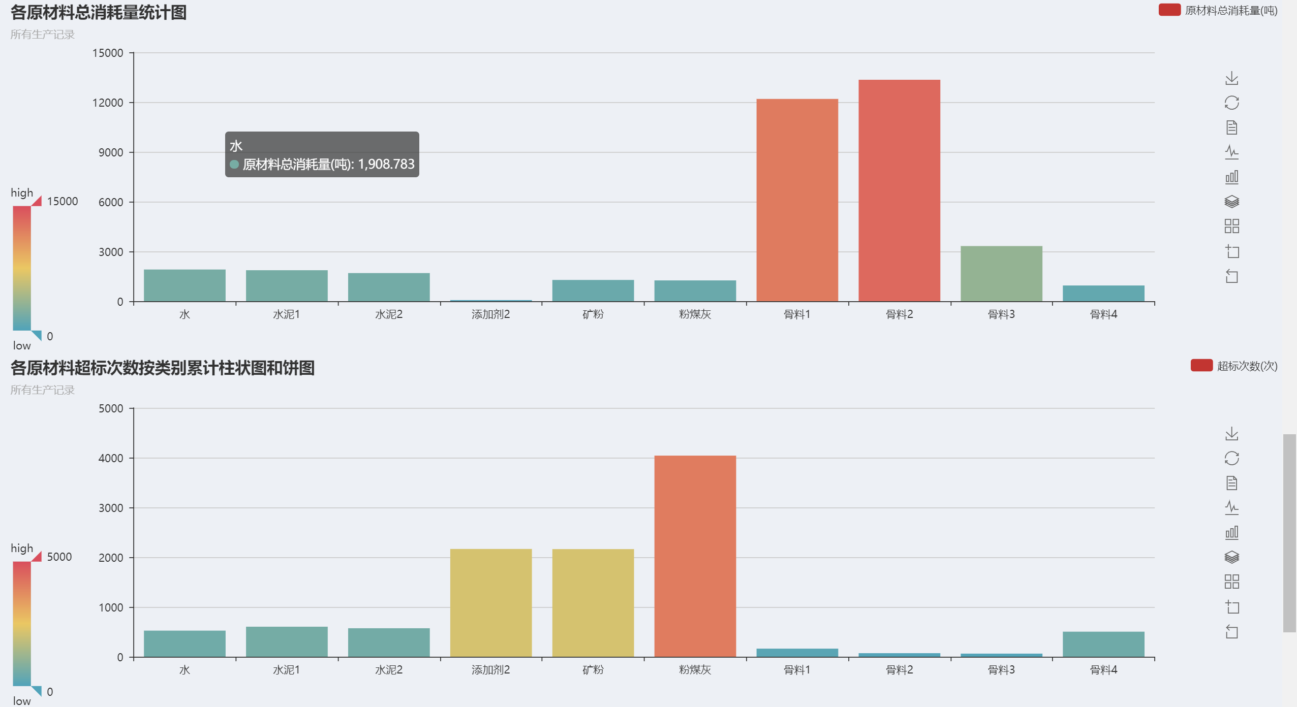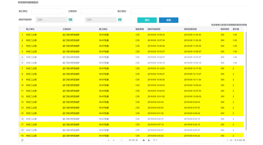 每盘混凝土混合料数据含施工单位、工程名称、施工部位、强度等级、搅拌开始结束时间、搅拌时长、盘方量。对原材料超标以高亮方式提醒。超出规范显示黄色,严重超标(误差10%以上)显示红色。