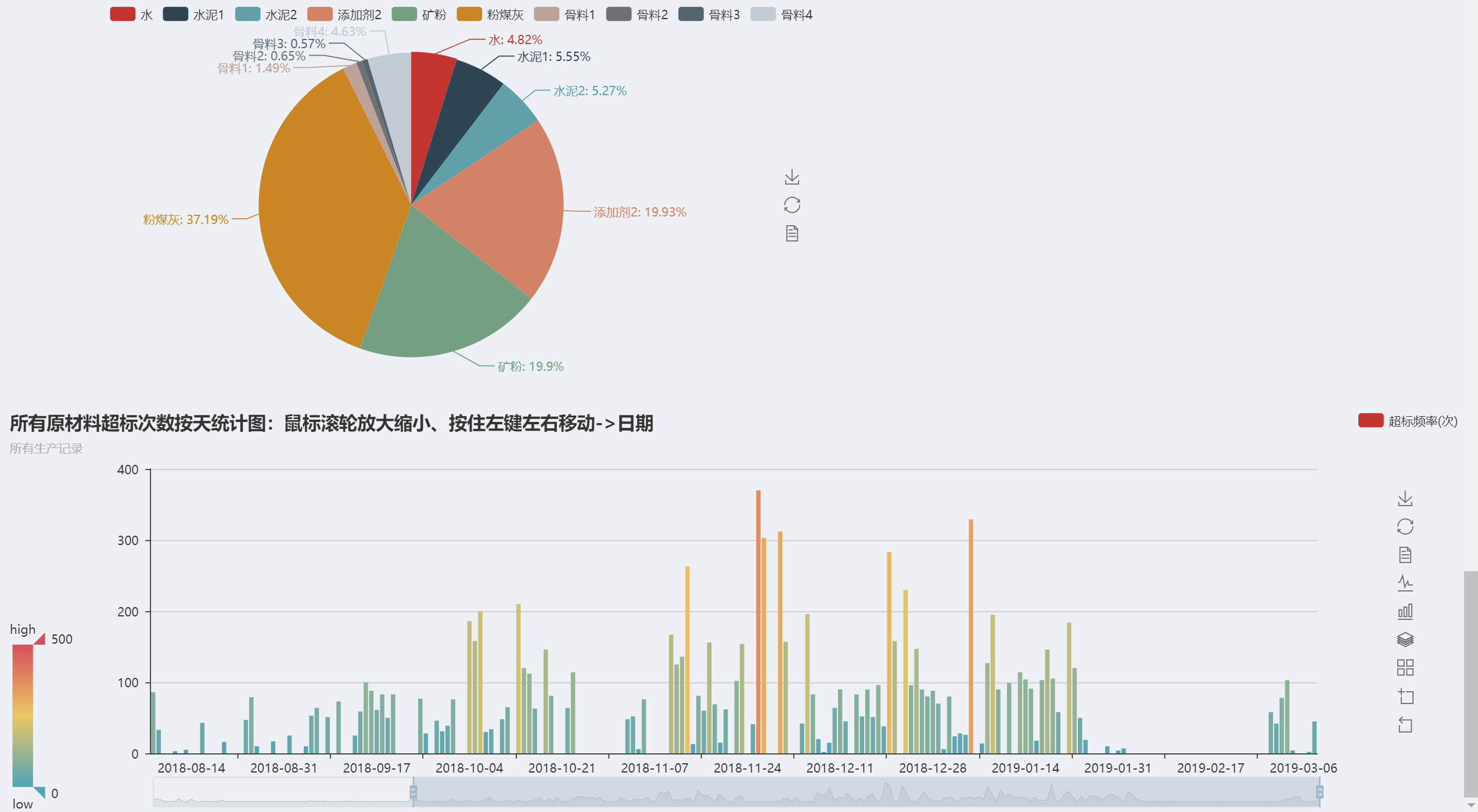 各原材料超标累计次数占比和所有原材料每天超标总次数统计