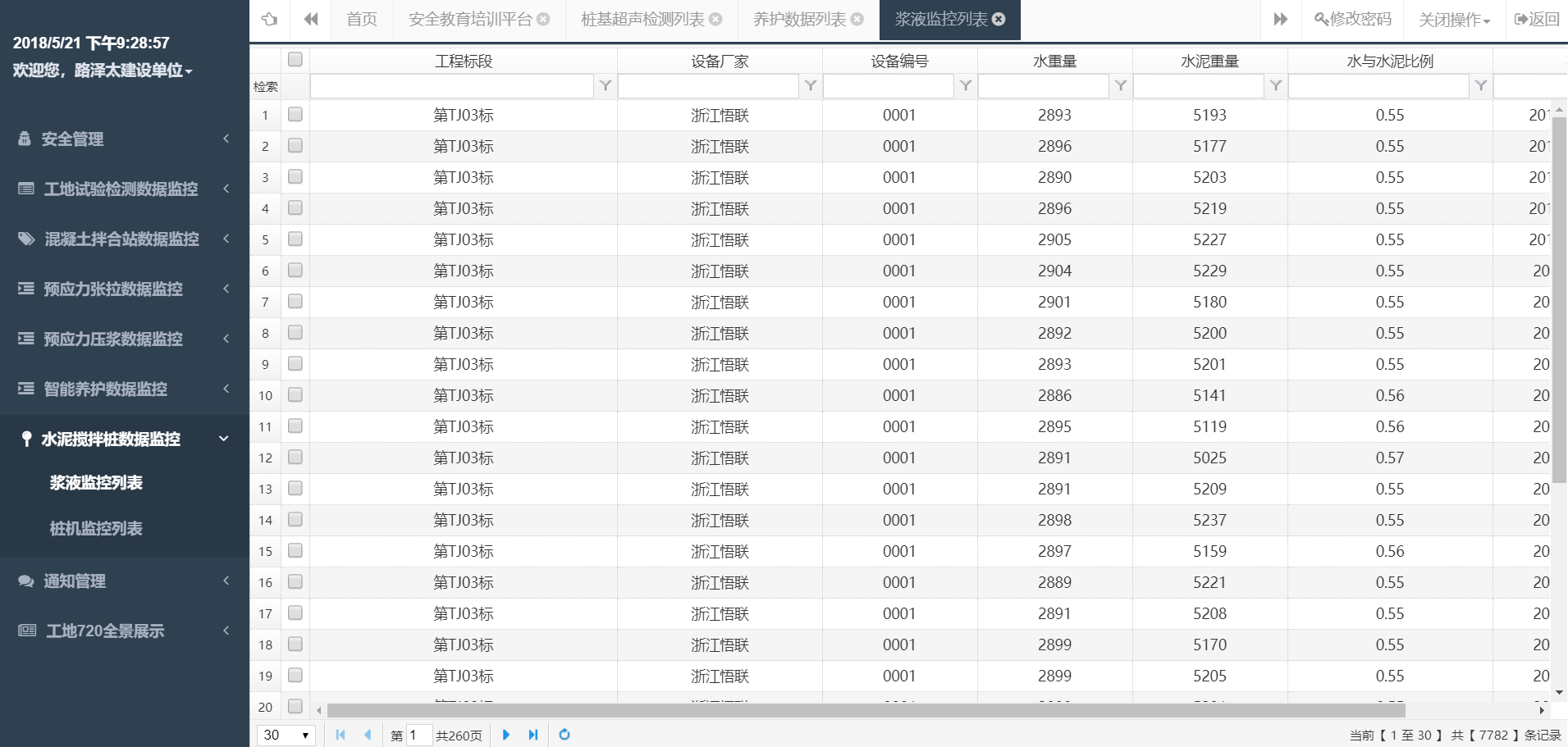 每条记录对应后台搅拌一锅水泥浆液拌合料;监控数据包括工程标段、设备厂家、设备编号、水和水泥重量、水灰比、搅拌时间。