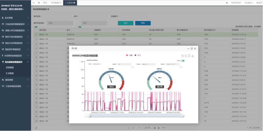 每条记录对应前台施工每一根高压旋喷桩;监控数据包括项目名称、设备编号、桩号、水泥浆密度、累计施工时间、累计浆量、累计灰量、结束时间、浆流量和压力曲线图。
